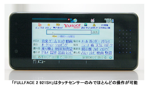 「FULLFACE 2 921SH」は、「FULLFACE」シリーズの第2弾端末。ワンセグの受信が可能で、液晶ディスプレイを上部にスライドすると操作キー部分が現れる「フラットフェイス・フルスライダー」と呼ぶデザインを採用する。