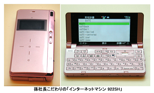 「インターネットマシン 922SH」は、孫社長が自ら企画立案したスマートフォンのような形状が特徴の端末。3月下旬に発売する。3.5インチのフルワイドVGAタイプの「NewモバイルASV液晶」と、パソコンと同じ配列のフルキーボードを搭載。「フルキーボードを搭載することで、携帯電話端末でもPCのようにインターネットを楽しんでもらいたい」(孫社長)という狙いから電子辞書のように横に開くデザインを採用した。