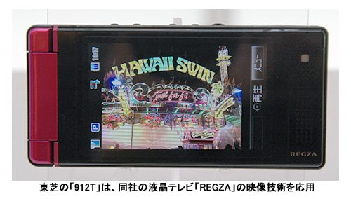 「921T」は、東芝の液晶テレビ「REGZA(レグザ)」のブランド名を冠したワンセグ対応の「REGZAケータイ」。ディスプレイは2.8インチのワイドQVGA有機ELを採用。最大10000:1という高いコントラストで、高精細で色鮮やかなワンセグの映像を楽しめる。