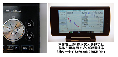 高機能端末をラインアップする一方、東芝製の子供向け端末「コドモバイル 820T」や、東芝製で初のシニア向け端末「かんたん携帯 821T」、SBIイー・トレード証券での株取引ソフトを搭載した「株ケータイ SoftBank 920SH YK」と個性的な端末も揃えた。