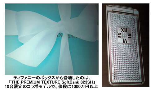 発表会で最も注目を集めたのが、世界的な米国の宝飾品ブランド「ティファニー」とコラボレーションした“ティファニーケータイ”の「THE PREMIUM TEXTURE Soft Bank 823SH」(シャープ製)。