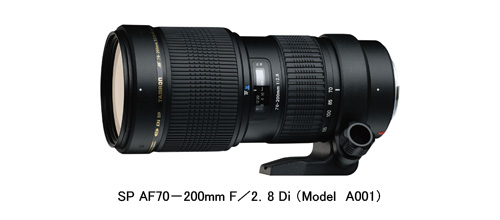 「SP AF70-200mm F/2.8 Di LD[IF]MACRO(Model A001)」は、35mmフィルムカメラで焦点距離70-200mmのズームレンズ。F2.8と明るい大口径レンズながらコンパクトなのが特徴。全ズーム域で最短撮影距離が0.95mmと短く、200mm時の最大撮影倍率は1:3.1。LD(異常低分散)レンズを3枚使用し、画像の色にじみを抑えた。