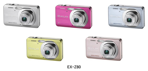 「EXILIM ZOOM EX-Z80」は、アクセサリー感覚で持ち歩ける可愛らしい小振りなサイズが特徴。ピントを合わせるフォーカス枠にハート型のマークを選ぶことができ、ピントが合うときれいなハート、合っていないとハートが割れるなど、遊び心あふれる機能も搭載した。有効810万画素のCCD、35ミリフィルムカメラ換算で38-114mmの光学3倍ズームレンズを搭載する。カラーはシルバー、ビビッドピンク、ピンク、グリーン、ブルーの5色。本体サイズは幅89.7×高さ51.7×厚さ19.0mm、重さは100g。