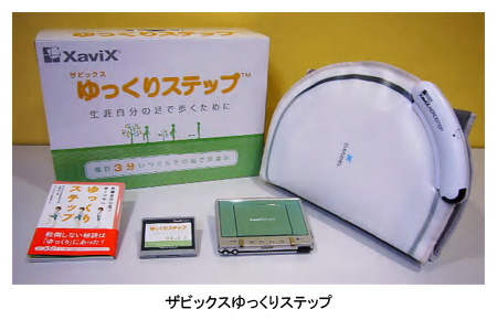 「ザビックスゆっくりステップ」は、健康コンピュータ「ザビックス・ポート」とマット型の「ステップセンサ」を使い、テレビ画面のインストラクターに合わせながら行う比較的穏やかで簡単な歩行訓練システム。個人個人の歩行能力を測定・数値化することで、それぞれにあった訓練目標を設定ができ、さまざまな症状の人に対応できる。また、専門医が患者に対して行う運動処方に基づいたトレーニングを自宅でできる機能もある。