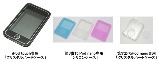 第3世代iPod nano専用ケース2種は、本体にストラップホイールを備える。シリコンケースは素材にシリコンゴムを使用し、クリアホワイト、クリアピンク、クリアブルーの3色のカラーバリエーションを用意。何度も貼り直し可能な液晶保護フィルムも付属する。価格は780円。一方、クリスタルケースは高品質ポリカーボネートを使用し、液晶保護フィルムに加え、ホイール部分を保護するシリコンカバーが付属する。価格は1480円。