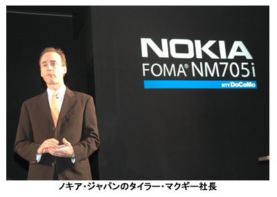 会見でノキア・ジャパンのタイラー・マクギー社長は、「当社は昨年、世界で約4億3700万台の携帯端末を販売した3G端末では世界ナンバーワンメーカー。NM705iのヨーロッパ的なデザインは、日本でも広く受け入れてもらえる」と、端末の販売に自信をみせた。