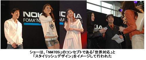 発表会は、ファッションショー形式で開催。「NM705i」のコンセプトである「世界対応」と「スタイリッシュデザイン」をテーマに、「世界対応」では海外旅行をするカップルにふんしたモデルがNM705iで国際電話をかけるシーン、「スタイリッシュデザイン」ではパーティドレスを着た男女モデルがNM705iを使う様子を次々に舞台で演じた。