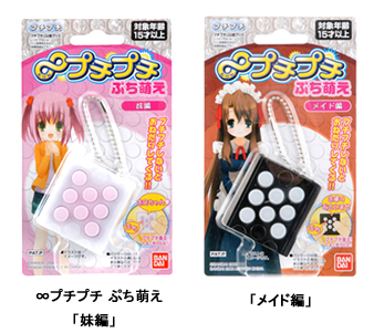 07年9月の発売から9日間で30万個を販売した「∞プチプチ」の新シリーズ。従来モデルでも100回に1回「プチッ」以外の音が聞けたが、新たに「妹編」「メイド編」「ツンデレ編」「幼なじみ編」のそれぞれに合わせて4種類の「萌えボイス」が聞けるようになった。