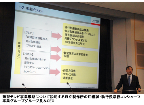 コスト削減については、固定費の30%カットを目標に営業費用を地域別に見直す。また製造コストは材料調達、設計、パネル加工の製造工程を改善することで20%以上の削減を見込む。今後主力とする超薄型モデルではパネル部とチューナー部の分離し、無線でつなぐモデルを想定していることから、パネルを日本、チューナー部を販売地域が手がけることで開発コストも抑える。流通費用は週単位での生産、在庫調整を徹底することで、06年度比でコストを30%削減する。