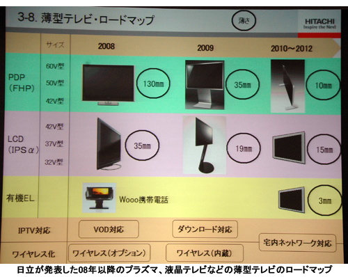 日立製作所は2月8日、薄型テレビについての事業戦略説明会を開き、07年末に発売した超薄型液晶テレビ「Wooo UTシリーズ」などの超薄型テレビを09年にはプラズマでも展開すると明らかにした。赤字転落したデジタルメディア・民生部門のテコ入れのため、高付加価値モデルで1台あたりの単価を高める一方、営業などの固定費や製造原価、流通費用を削減。利益率を高める。同時にプラズマパネルの外販も進め、収益拡大を狙う。