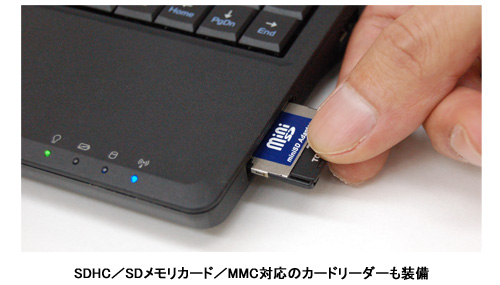 また、ブログの更新にも非常に便利。SDHCメモリカード、SDメモリカード、MMCに対応したカードリーダーを装備しているので、デジカメや携帯電話などで撮影した写真を、撮ったその場で取り込んですぐにブログにアップすることが可能だ。リアルタイムで旅行の風景をアップしていけば、旅の楽しみも広がるだろう。