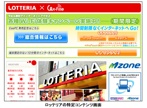 この「Wi-fine」、通常はエリアごとのコンテンツしか閲覧できないのだが、現在「Eee PC」ユーザーを対象にしたインターネット無料接続キャンペーンを実施している。接続可能なのは1日1回だけだが、時間制限はなく、気の済むまでインターネットを利用できる。