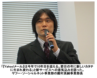 コンセプトは「速さ」「わかりやすさ」「利便性」。「速さ」では、従来のHTMLベースからFlashベースに変更。Webメール特有のレスポンス時間を大幅に解消したという。「わかりやすさ」と「利便性」では、マイクロソフトのメールソフト「Outlook」風のインターフェイスを採用することで実現した。インターフェイスの変更の理由について、ヤフーソーシャルネット事業部の殿村英嗣事業部長は「誰もが普段から使い慣れているインターフェイスを採用することで、抵抗なく『Yahoo!メール』を使っていただくことができる」と説明した。