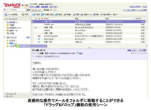 主な新機能として、ドラッグ&ドロップで直感的にメールをフォルダに移動できる機能や、メールを一覧表示しながら内容も閲覧できるプレビュー機能、同時に複数の操作を可能にするタブ機能を追加。そのほか、ショートカットキーや右クリックメニューも新たに導入した。また、ユーザーからの要望が多かった、フォルダ内のメールを一度にまとめて処理できる「全件処理」も可能にした。一方、メールボックスの容量は1GBで、1回の最大送受信容量は20MBと、現行の「Yahoo!メール」と同じ。