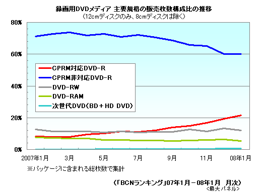 DVD-RWとDVD-RAMはほとんど変わらず、現在市販されているBD規格のBD-R、BD-RE、HD DVD規格のHD DVD-Rを合算した「次世代DVDメディア」は0.1%から08年1月には0.5%とわずかにアップした。ちなみに、08年1月の次世代DVDメディアの規格別内訳は、BDが97.6%、HD DVDが2.4%。BDに限ると、BD-Rが67.7%、BD-REが32.3%を占めた。