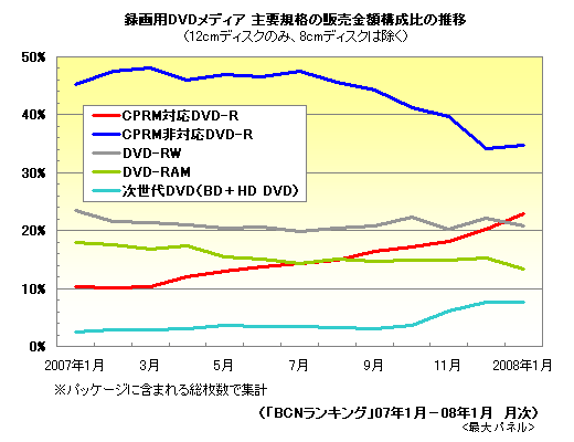 一方、販売金額に視点を移すと、1枚あたりの単価が高い次世代DVDメディアの伸びが著しい。特に次世代DVDレコーダー商戦が本格化した07年11月には、それまでの2-3%台から6.2%に上昇。翌月12月、08年1月も7%台と、好調を維持している。