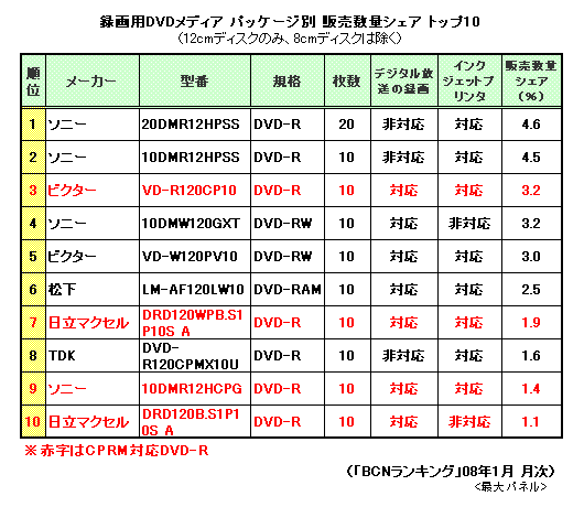 では実際に売れている製品を紹介しよう。12cmサイズの録画用DVDに限った、08年1月のパッケージ別の販売数量シェア1位は、ソニーのCPRM非対応DVD-Rの20枚パック「20DMR12HPSS」、2位には同じディスクの10枚パック「10DMR12HPSS」が入った。