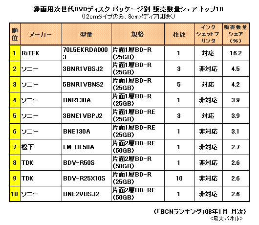 1位を除いて、トップ10はすべて10枚入りパック。CPRM対応DVD-Rは、3位のビクター「VD-R120CP10」、7位の日立マクセル「DRD120WPB.S1P10S A」など計4製品がランクインした。このほか、4位のソニー、5位のビクターのDVD-RW、6位の松下のDVD-RAMもCPRM対応ディスクで、デジタル放送の番組を記録することができる。また、1位をはじめ8製品が、レーベル面に番組タイトルなどを印刷できる「インクジェットプリンタ対応」タイプとなっており、規格やメーカーを問わず、人気を得ているようだ。次世代DVDディスクに限ると、RiTEKの片面1層25GBのBD-R「70L5EKRDA0003」がトップに立ち、全体でも37位に食い込んだ。次世代DVDメディア全体の1枚あたりの税別平均単価は1200円程度。店頭では次世代DVDメディアのなかで一番安い、容量25GBのBD-Rがそれくらいの価格で売られている。