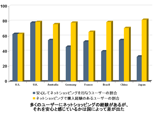 オンラインショッピングについては、全体では約半数のユーザーが安心してサービスを利用していると回答。成人ユーザーでショッピングを安心して行っている割合がもっとも高かったのはイギリスで78%。日本は33%で8か国中最低だった。同じく成人で、ショッピングで個人情報送信する際、もっとも安心感を抱いているのは中国で49%、日本では5%とこちらも一番低い値を記録。日本のユーザーの用心深さが浮彫りになった。