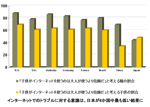 8-17歳までの子どもでは、5人に1人が「親が知ったら許さないだろうという活動」をインターネットで行っていると回答。一方、親が子どものネット利用を監視しているのはアメリカでも31%、日本ではわずか7%にとどまった。また、「子どもがインターネットを使う場合、大人が使う場合より安全度が低い」と感じている親の割合は、アメリカの88%を筆頭にいずれの国も7-8割に達しているものの、日本の親は44%。さらに、セキュリティソフトの利用や、ネット利用について子どもと話し合う親の割合も、日本は世界平均を下回った。日本の親は、子どもがネットを利用する際にさられている危険性を過小評価している、という実態が明らかになった。