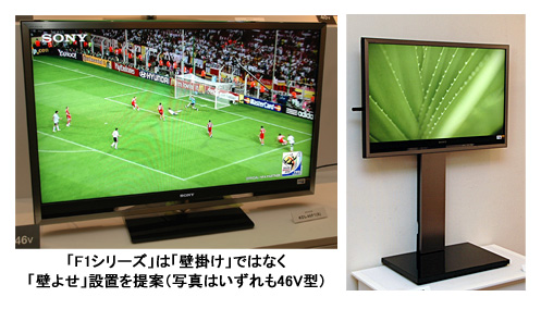 「F1シリーズ」は、46V型でディスプレイの薄さが約7.4cmという歴代の「ブラビア」シリーズで最薄を実現。壁の強度の問題で、壁掛け設置ができないユーザーが多いという調査結果から、新たに壁にぴったりつけて設置する「壁よせ」スタイルを提案した。46V型と40V型モデルはフルHDに対応するほか、全モデルに純度の高い色を表現する「ライブカラークリエーション」を採用。倍速120コマの表示が可能な「モーションフロー」機能と合わせ、スポーツ中継など動きの速い映像もなめらかに表現する。