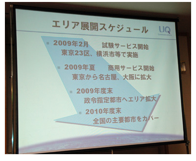 同社では09年2月に東京23区や横浜を中心に試験サービスを開始。09年夏には東京、名古屋、大阪にエリアを拡大し商用サービスを始める。10年度末には全国の主要都市をカバーする計画。利用料金は、月額3200円前後を想定している。国際ローミングも視野に入れており、現在、韓国のKTや米スプリント・ネクステルと交渉を進めているという。