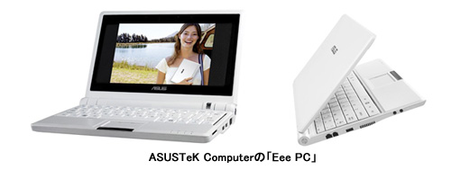 もっと、手軽に持ち運びたいという人には、ディスプレイサイズが1桁台のコンパクトモデルがオススメ。ASUSTeK Computerの「Eee PC」は5万円を切る価格でいま注目の製品だ。ディスプレイサイズは7型ワイドで、重さは約920gという、片手で簡単に持ち運べるほどのコンパクトサイズだ。基本スペックも充実し、インターネット端末としてや、サブのノートPCとしてなら十分に活用できる性能を備える。