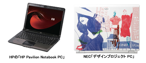 個性を演出したいなら、天板に模様やイラストが入ったPCを選ぶのもいい。HPの「HP Pavilion Notebook PC」シリーズは、水面の波紋や、エネルギーの噴出などをモチーフとしたユニークな模様を、天板やパームレストに施す。NECのオンラインPC販売サイト「NEC Direct」では、イラストレータの木村敏子によるイラスト入りPCやポップなストライプカラーのモデル、「ハローキティ」モデルなど、個性溢れるPCをラインアップする。人と違うものを持ちたいと思ったら、一度チェックしてみよう。