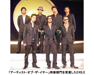 07年1年間の楽曲の売上金額が最も多いアーティストに授与する「アーティスト・オブ・ザ・イヤー」は、邦楽部門はEXILEが、洋楽部門はアヴリル・ラヴィーンが受賞した。EXILEの実績は、アルバムが233万8242枚、シングルが112万3798枚、ビデオが23万3938枚、配信が849万9430ダウンロード。アヴリル・ラヴィーンは、アルバムが100万7164枚、シングルが2万6163枚、ビデオが4092枚、配信が220万2812ダウンロードだった。EXILEのメンバーは、トロフィー授与の際のコメントで「人と人、心と心をつなぐ音楽をこれからも提供していきたい」と抱負を語った。
