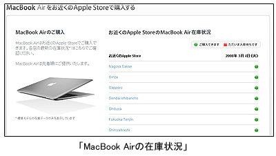 全国に7店舗あるアップルの直営店「Apple Store」でも、在庫の状態は流動的だ。そのため同社では「こんなページを作ったのは初めて」(広報)としながら、Webサイト上で在庫情報を流している。「MacBook Airの在庫状況」というページで、21時から翌日9時までの間、翌朝から店舗ごとで販売できるAirがあるかどうかを示すものだ。すぐに現物を手に入れたいなら、このページで確認して、翌朝早めに近くのApple Storeに出かけるのがよさそうだ。