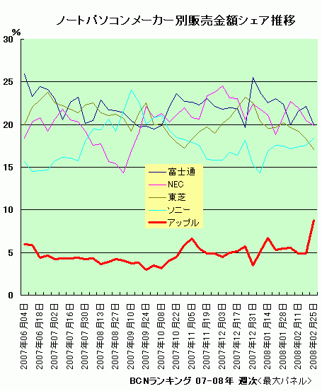 ノートパソコンは、富士通、NEC、ソニー、東芝の4社が20%前後のシェアを争う状況。アップルは7%以下で推移してきた。しかし、ここに来て8.8%と2桁に手が届く状況になっており、明らかに潮目が変わってきている。Airの品薄状態が解消されてくれば、同社のノートがさらに勢いづくことも十分ありそうだ。(BCN・道越一郎)