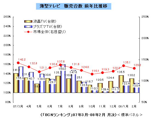 08年1月?2月の液晶とプラズマを合わせた薄型テレビ市場は、販売台数・金額ともに好調に推移。07年の年末商戦期の11?12月を前年比で上回った。市場全体では、12月の販売台数は対前年比で122.9%だったが、1月には135.1%、2月でも129.2%。販売金額でも108.7%だった12月に比べて1月には113.4%、2月も110.0%と、それぞれ2ケタの伸びを記録した。