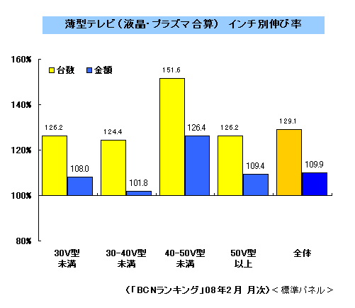 一方、液晶とプラズマに分けると両者で異なる傾向が出ている。パネル別に見る2月の販売台数は、液晶が前年比130.2%、プラズマは120.4%で07年9月からのプラズマより液晶のほうが高い成長を続けている傾向に変化はない。しかしインチ別では、液晶は台数で168.1%、金額で151.6%。伸びが最も大きかったのが「50V型以上」。これに対し、プラズマは1まわり小さい「40?50V型」が台数で166.6%、金額127.4%と最も大きい伸びを示した。