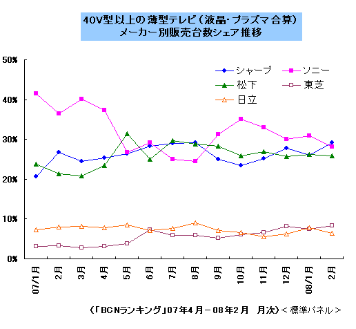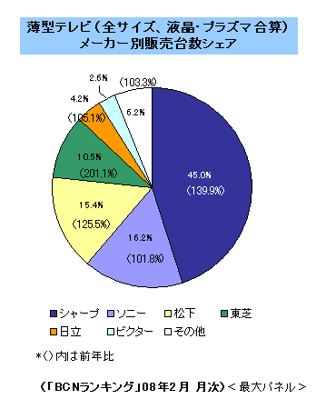 一方シャープは40V型以上の構成比は27.2%と少ないが、30V型未満が24.2%、30?40V型未満が48.6%で中小型から大型まで幅広くカバーする。そのため販売台数のメーカーシェアを全サイズ、液晶・プラズマ合算で見てみると、2月の1位はシャープで45.0%、2位でシェア16.2%のソニーに比べても圧倒的優位を確保している。なお、10.5%で4位につけている東芝は、昨年に比べシェアを倍増させており、ソニーと3位15.4%の松下と合わせた3社で2位争いが熾烈になってきている。