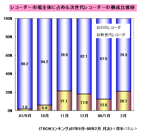 08年1月に東芝が「HD DVD」規格の撤退を発表したことで、ソニーらが推す「ブルーレイディスク(BD)」に事実上一本化し、次世代DVDの規格争いは終息した。まだ若干数販売されているHD DVDレコーダーとBDレコーダーを合わせると、2月時点での次世代レコーダーの比率は、従来レコーダーも含めた市場全体の販売台数構成比で20.7%を占めた。