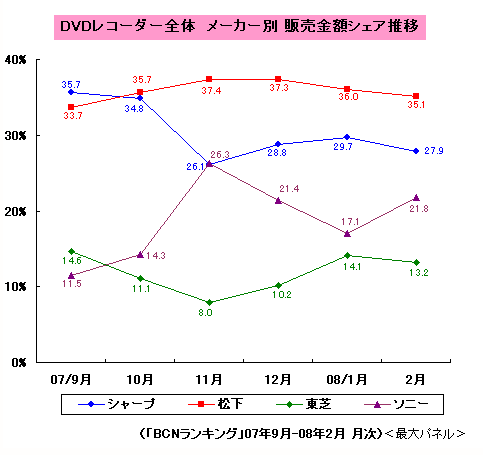 2月、レコーダー全体の販売台数シェアで1位は32.4%の松下、2位は31.6%でシャープだった。次世代レコーダー市場で57.6%の圧倒的なシェア占めるソニーは、レコーダー全体では3位の東芝にも抜かれシェア13.8%で4位。しかしBDレコーダーを中心に販売するソニーは金額シェアではすでに東芝を抜いており、21.8%で3位に入っている。従来のレコーダーでも新製品を併売する松下・シャープの2強に、新製品はBDレコーダーに集中するソニーが追い上げをかけているという状況だ。
