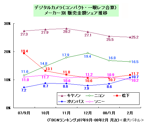2月のデジカメ全体の販売台数シェアでは、1位がキヤノンで22.0%、2位集団は12%前後のシェアでオリンパス、松下、カシオ、ソニーが争っている。金額シェアではデジタル一眼が好調なニコンが07年10月から2位に浮上し、2月もシェア16.5%で2位をキープしている。
