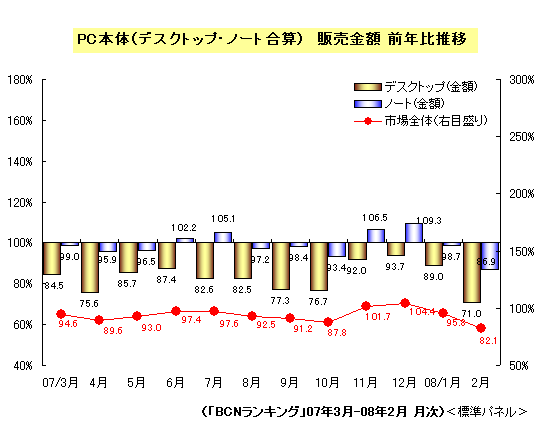 08年1?2月は、デスクトップPCとノートPCを合わせた市場全体で、販売台数・金額ともに前年比でマイナス成長が続いた。2月は台数前年比で約10%のマイナス、金額では約18%のマイナスだった。07年11?12月はなんとかプラスに転じていたが、08年に入りちょうど1年前の07年の1?2月はマイクロソフトの新OS「Windows Vista」が発売された頃でもあり、前年比で落ち込みが目立つ。