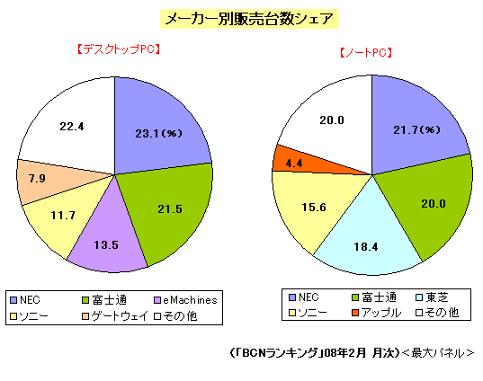 PC全体の販売台数シェアで1位は22.0%のNEC、2位は20.3%で富士通、5位には5.5%でアップルが入った。デスクトップのみに限定すると1位2位は変わらず、3位にはシェア13.5%でeMachinesが入った。ノートPCに限定すると3位には18.4%で東芝が入った。