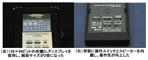 本体裏側に、各種設定スイッチのほか小型スピーカーも内蔵。本体だけで収録した音の確認ができる。表示分には前モデルより面積を2倍に拡大した128×64ビットの大型の有機ELディスプレイを採用した。再生速度を1/2倍速から1.5倍速までの10段階で設定できる可変再生機能や、入力レベルを自動調整して録音ミスを防ぐ「アナログ・リミッター」や「AGC(オート・ゲイン・コントロー)」も備える。