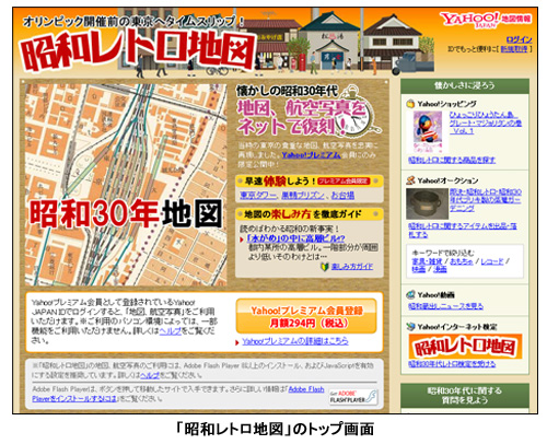 ヤフーは3月17日、同社が運営するインターネットサービス「Yahoo!地図情報」上で、「昭和30年代・東京23区の地図と航空写真」を中心に、当時話題となったニュースやランドマーク、街の様子、風俗などを写真や読み物で紹介する「昭和レトロ地図」特集を公開した。