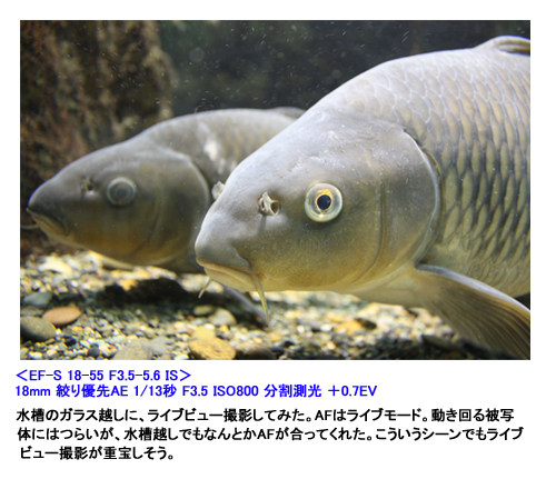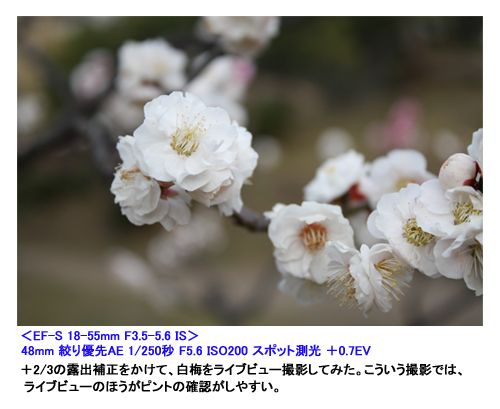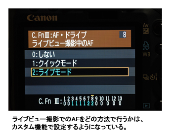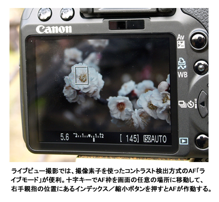 もう1つは、撮像素子を利用してコントラスト検出方式のAFを行う「ライブモード」。AFのスピードは遅くなるが、液晶モニタに被写体を表示したままピントが合っているかどうかを確認できる上に、十字キーでピントを合わせたい位置を自由に移動できるのがメリットだ。このモードは、上位機の「40D」にも搭載されていない機能で、動かない被写体を撮る分にはとても使い勝手がいい。「Kiss X2」でライブビュー撮影をするなら、AF方式は「ライブモード」に設定しておくことをおすすめしたい。