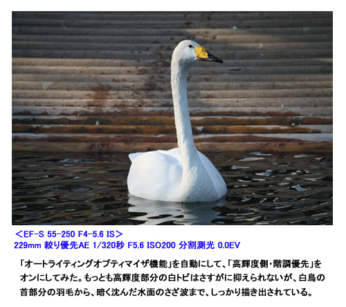 また、「高輝度側・階調優先」を使うことで、これまでなら白トビしてしまいそうな条件でも、かなり階調が救えることがわかった。ただ、P、Tv、Av、M、A-DEPモードでの「オートライティングオプティマイザ機能」の使用や、「高輝度側・階調優先」のオン・オフは、カスタムメニューから行わねばならず、設定がやや面倒に思う。