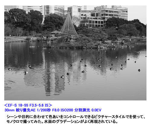 試用した週末は生憎と曇り空で日も差さず、「Kiss X2」の発色傾向やピクチャースタイルを変更することによる色合いの違い、「オートライティングオプティマイザ機能」のテストには必ずしも向いていなかった。それでも、撮影画像の精細感が十分にアップしていることは確認できた。さすがに1220万画素が効いている。