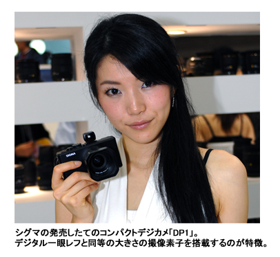 シグマのブースでは、発売したばかりのコンパクトデジタルカメラ「DP1」を大きくアピールしていた。デジタル一眼レフと同様の撮像素子を搭載しており、高画質の写真が撮影できる。発売後から品薄状態が続いている人気機種だ。