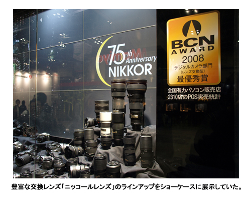 カウンターでは、実機を手にとって説明員にカメラについて詳しく話を聞くことができる。特にプロ用のデジタル一眼レフ「D3」や中級機モデルのデジタル一眼レフ「D300」について熱心に説明を求める来場者があとを絶たなかった。
