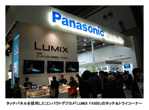 タッチパネルを採用したコンパクトデジタルカメラ「LUMIX DMC-FX500」のタッチ&トライコーナーでは、撮影後の画像を薄型テレビ「VIERA(ビエラ)」に表示して鑑賞するなど、同社のAV機器と連携した写真の楽しみ方を提案していた。