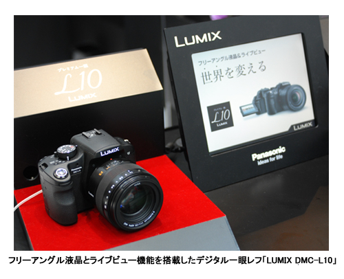 白が基調のコンパクトデジカメコーナーとは一転、デジタル一眼レフのコーナーは黒が基調。プロ・ハイアマ志向を強調したブースの色分けをしていた。デジタル一眼レフではフリーアングル液晶とライブビュー機能を搭載した「LUMIX DMC-L10」が注目を集めていた。