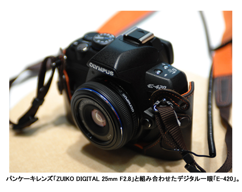 コンパクトデジカメ以上に目を引いたのが、デジタル一眼レフ「E-410」の後継機種、「E-420」。25mm F2.8の単焦点レンズと組み合わせでは驚くほど軽くコンパクトになるデジタル一眼だ。「E-420」では、ライブビュー機能で新たにコントラストAFが使えるようになった。ブースではライブビューでの撮影を試せるコーナーも用意していた。