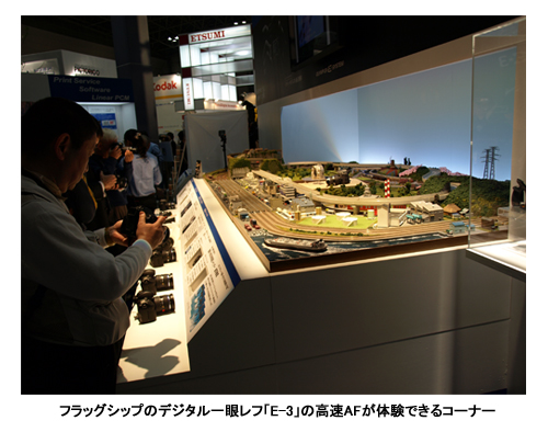 一方、フラッグシップのデジタル一眼レフ「E-3」では、走行する鉄道模型を撮影して、「E-3」の高速AFを体感してもらうコーナーを設けていた。